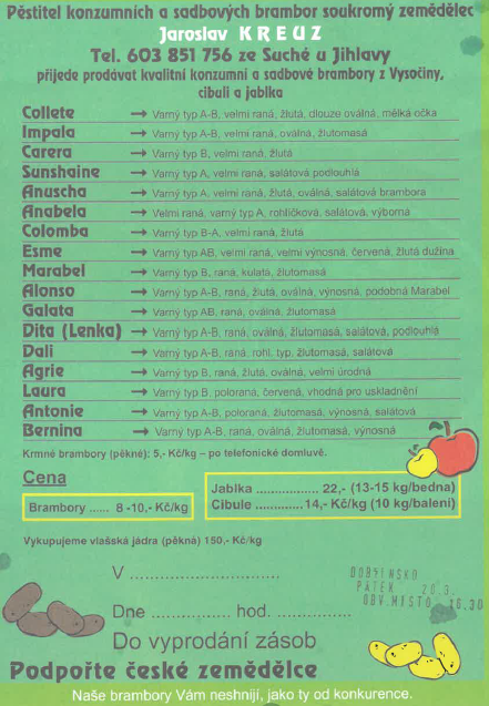 Soukromý zemědělec Jaroslav Kreuz přijede prodávat konzumní a sadbové brambory z Vysočiny, cibuli a jablka. Prodej proběhne v Dobřínsku na obvyklém místě (Pohostinství u Anežky). Cena brambor cca 8–10 Kč/kg, jablka cca 13–15 Kč/kg. Prodej do vyprodání zásob.